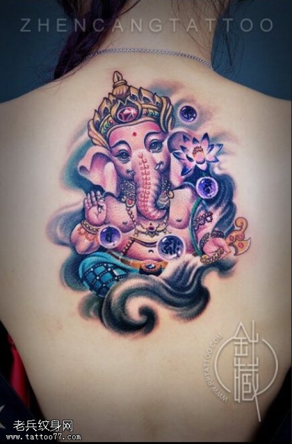 女性背部彩色象神纹身图案_后背纹身图案大全_纹身图吧