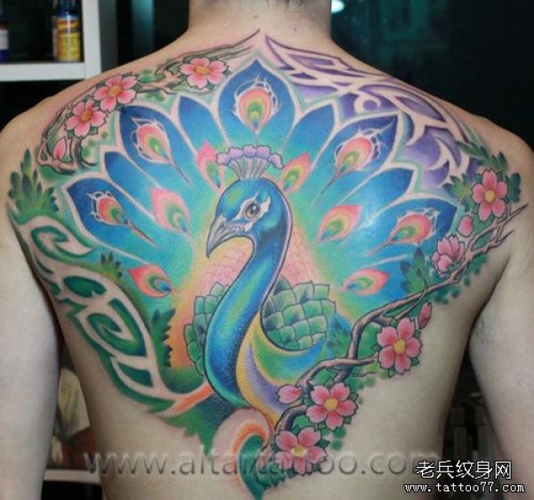 男生背部漂亮的彩色孔雀纹身图案_后背纹身图案大全_纹身图吧