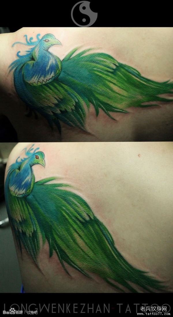 男生后背漂亮的彩色孔雀纹身图案_后背纹身图案大全_纹身图吧