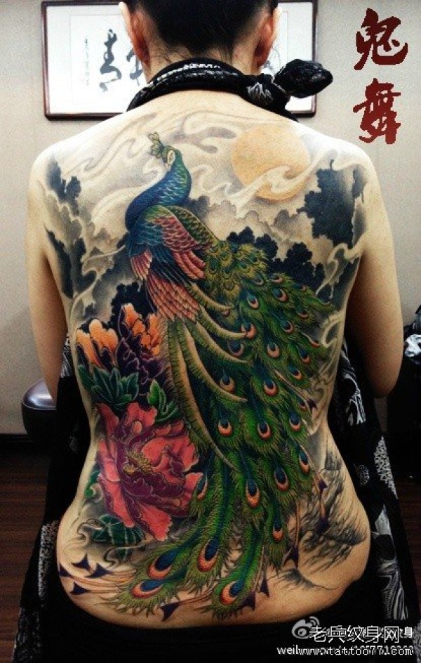 美女背部漂亮精美的满背孔雀纹身图案_后背纹身图案大全_纹身图吧