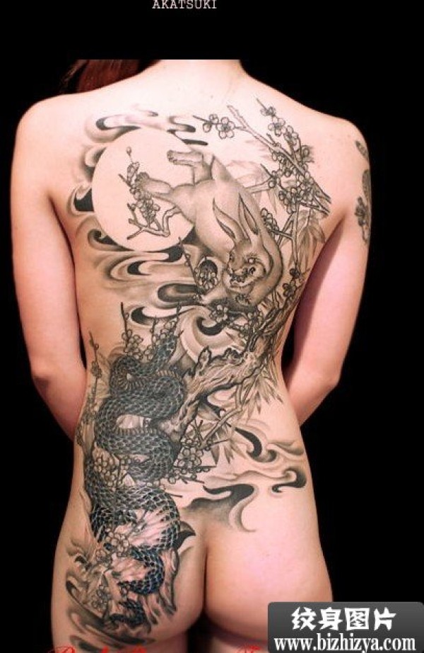 女子后满背月下蟒蛇和兔子纹身_后背纹身图案大全_纹身图吧
