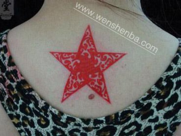 靓妹后背红色五角星纹身_后背纹身图案大全_纹身图吧