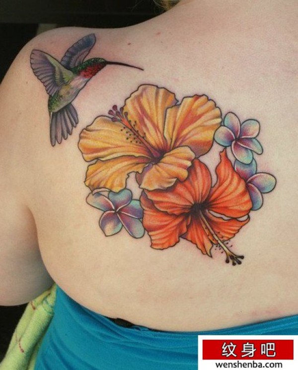 美女后背彩色花和鸟纹身组合_后背纹身图案大全_纹身图吧