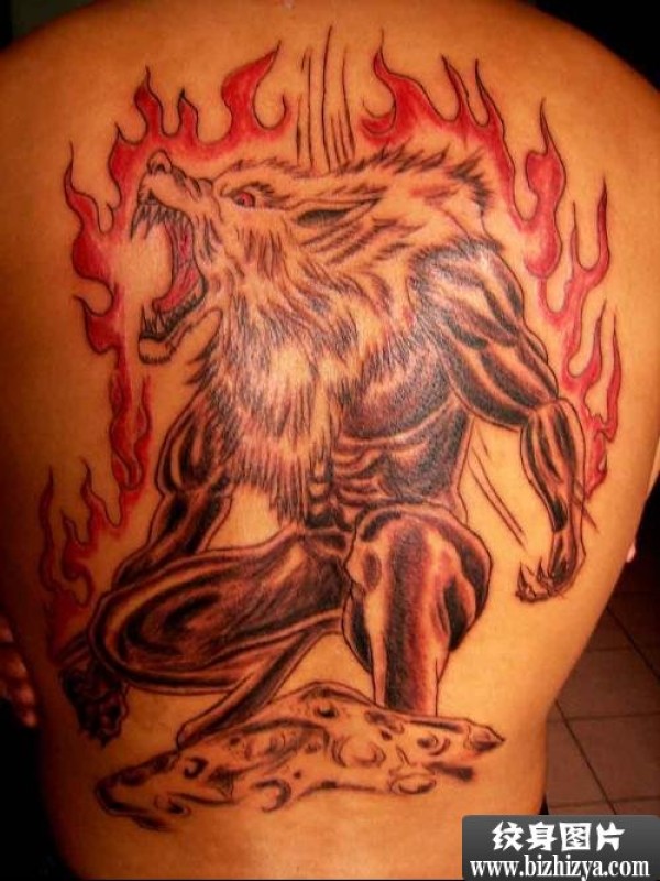 背部火焰狼人纹身作品_后背纹身图案大全_纹身图吧