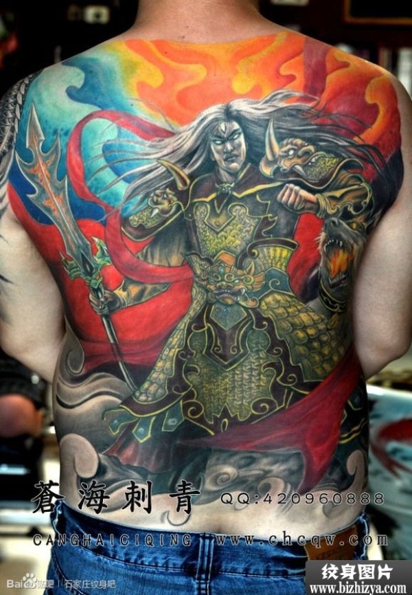 背部彩色二郎神杨戬刺青苍海纹身店作品_后背纹身图案大全_纹身图吧