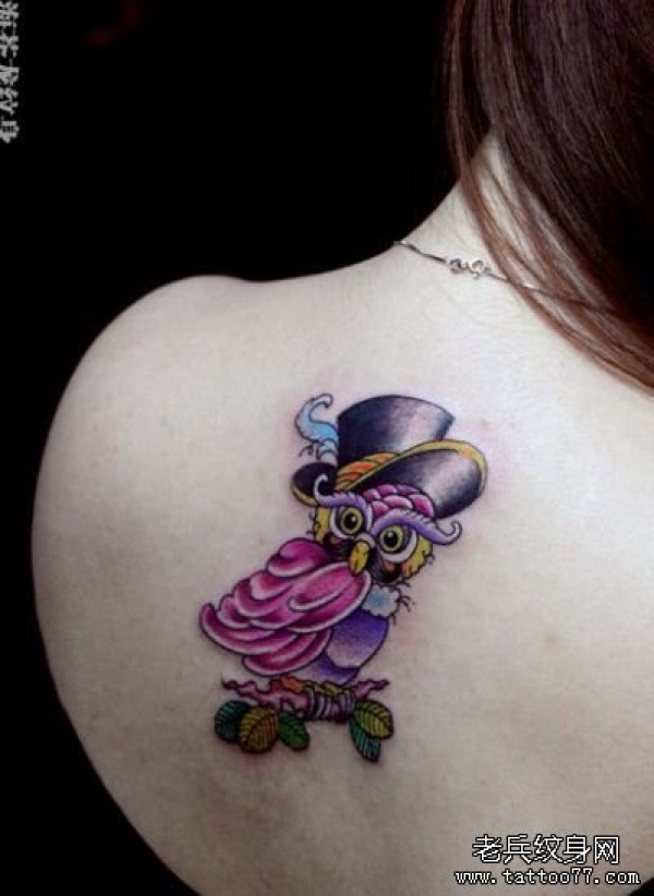 美女背部彩色猫头鹰纹身图案_后背纹身图案大全_纹身图吧