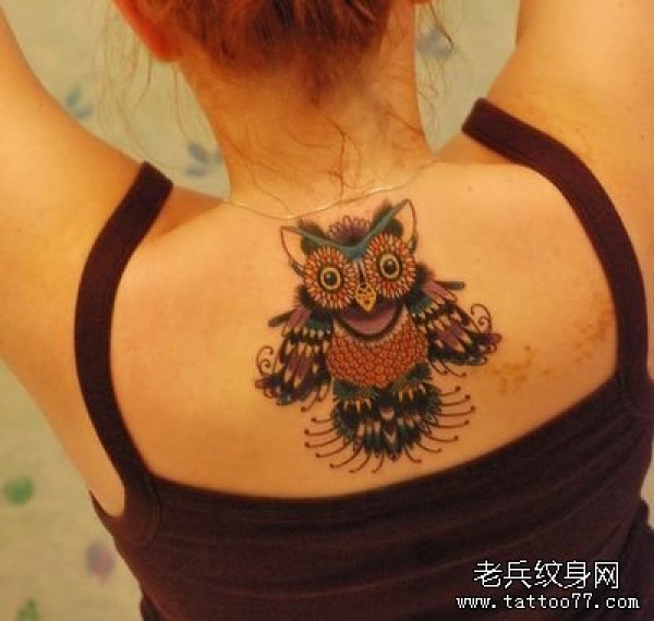 女孩子背部时尚精美的猫头鹰纹身图案_后背纹身图案大全_纹身图吧