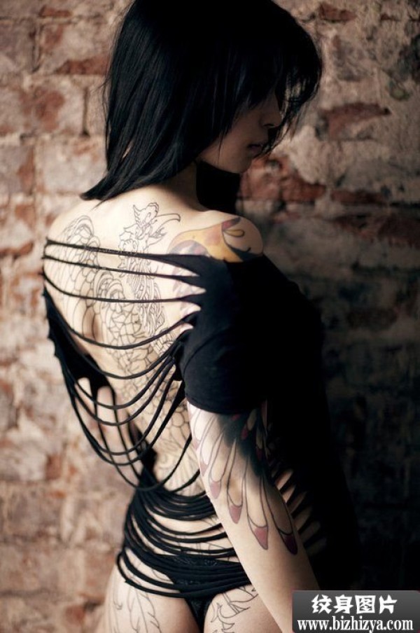 满背朱雀纹身的女孩图案图片_后背纹身图案大全_纹身图吧