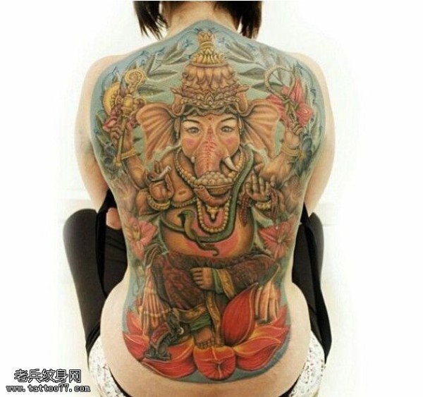 女性满背彩色象神纹身图案_后背纹身图案大全_纹身图吧