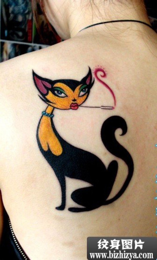 后背个性抽烟猫咪纹身图案图片_后背纹身图案大全_纹身图吧