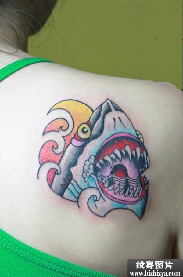 女人后背凶猛鲨鱼头纹身图案图片_后背纹身图案大全_纹身图吧