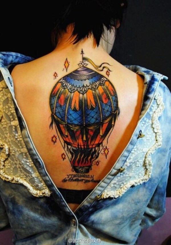 武汉纹身网推荐一款女性背部彩色热气球纹身_后背纹身图案大全_纹身图吧