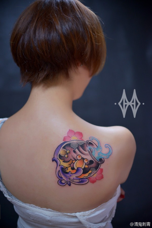 美女后背唯美的鱼缸与小金鱼纹身图案_后背纹身图案大全_纹身图吧