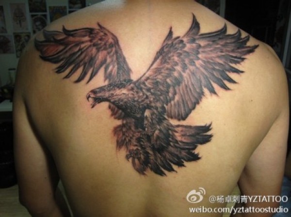 男人后背很酷时尚的黑灰老鹰纹身图案_后背纹身图案大全_纹身图吧