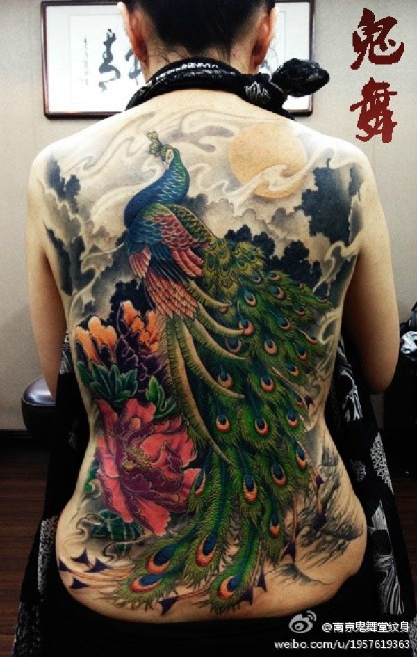 超帅精美的美女满背孔雀纹身图案_后背纹身图案大全_纹身图吧
