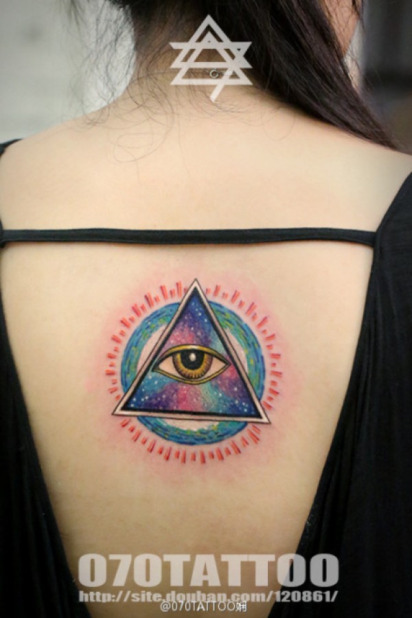 美女后背漂亮精美的彩色星空全视之眼纹身图案_后背纹身图案大全_纹身图吧