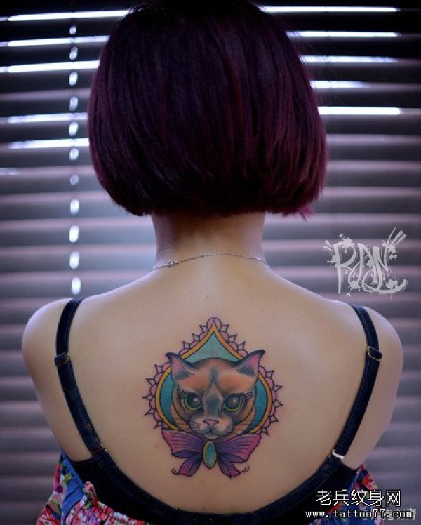 女孩子后背呆呆的一款猫咪纹身图案_后背纹身图案大全_纹身图吧