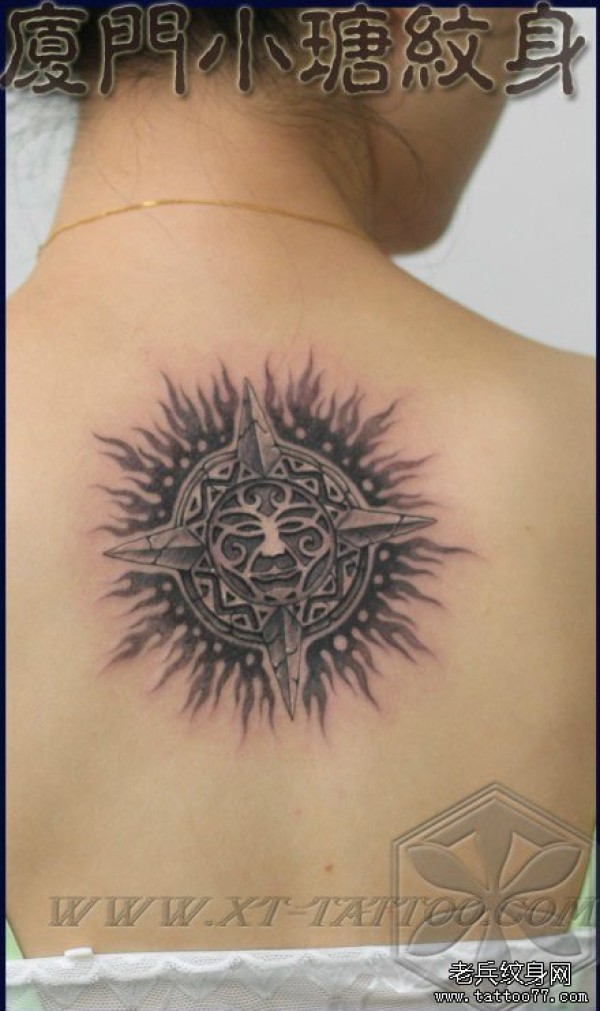 后背一款潮流时尚的部落石雕太阳纹身图案_后背纹身图案大全_纹身图吧