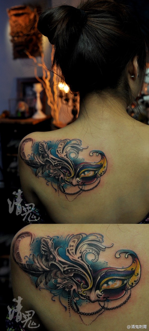 美女后背漂亮精美的面具纹身图案_后背纹身图案大全_纹身图吧