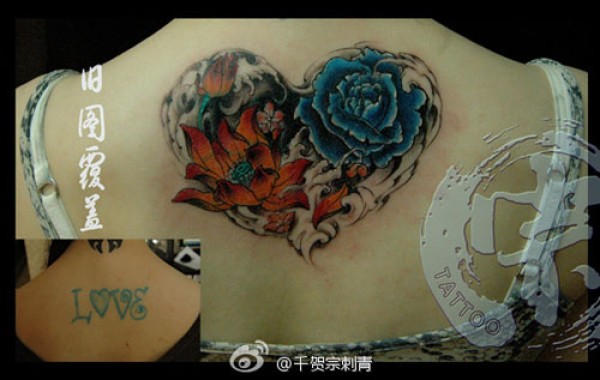 美女后背时尚漂亮的爱心莲花与牡丹纹身图案_后背纹身图案大全_纹身图吧
