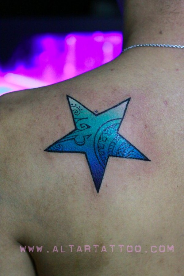 男生背部好看时尚的彩色五角星纹身图案_后背纹身图案大全_纹身图吧