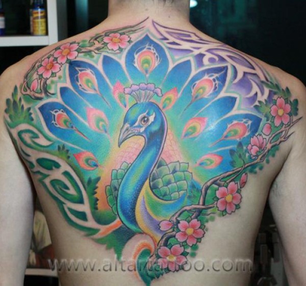 男生背部漂亮的彩色孔雀纹身图案_后背纹身图案大全_纹身图吧