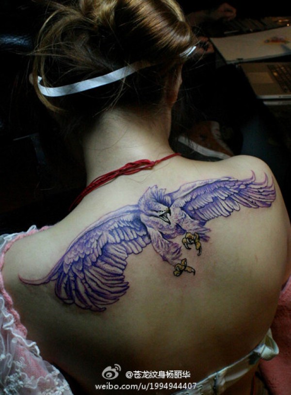 美女背部精美的彩色老鹰纹身图案_后背纹身图案大全_纹身图吧