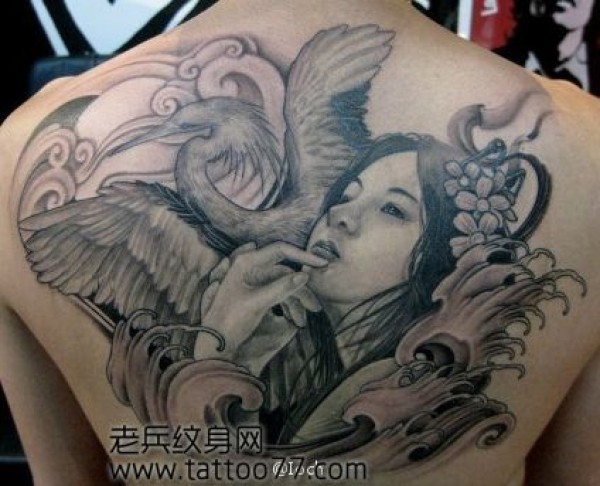 背部漂亮的美女与白鹤纹身图案_后背纹身图案大全_纹身图吧