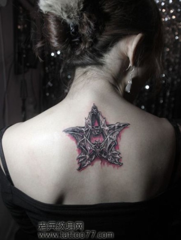 女孩子背部一款蝙蝠五芒星纹身图案_后背纹身图案大全_纹身图吧
