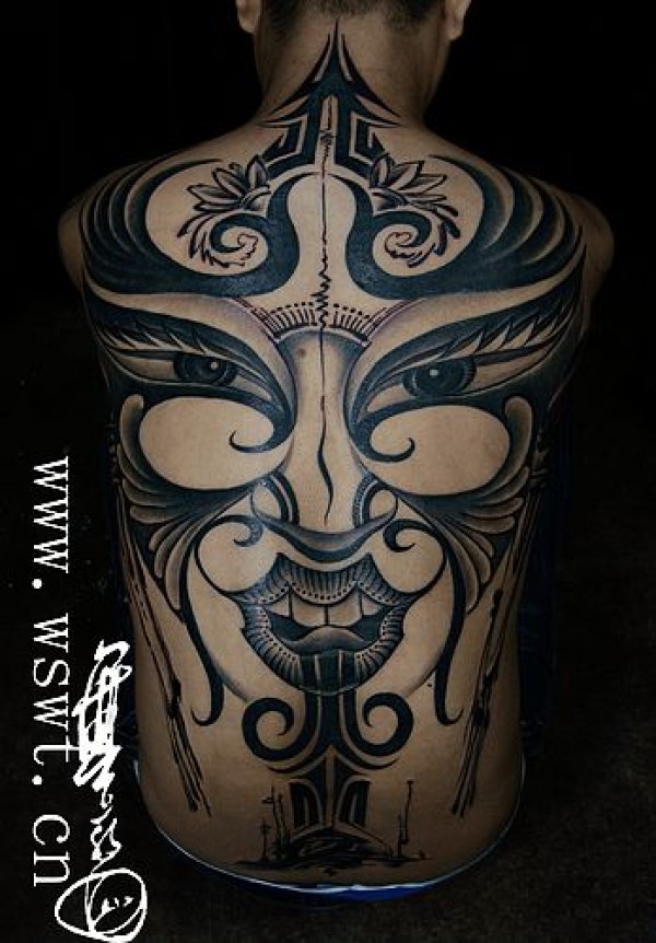 武汉专业文身男人满背脸谱纹身图案图片大全_后背纹身图案大全_纹身图吧