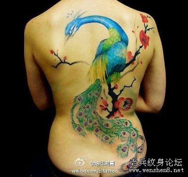 美女背部彩色孔雀纹身图案纹身图片_后背纹身图案大全_纹身图吧