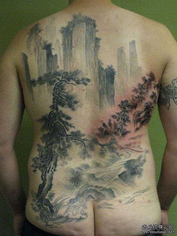 满背山水松树纹身图案纹身图片_后背纹身图案大全_纹身图吧