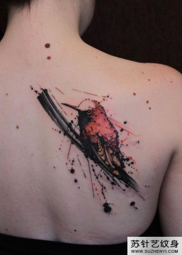 最新时尚水墨风蜂鸟后背时尚纹身_后背纹身图案大全_纹身图吧