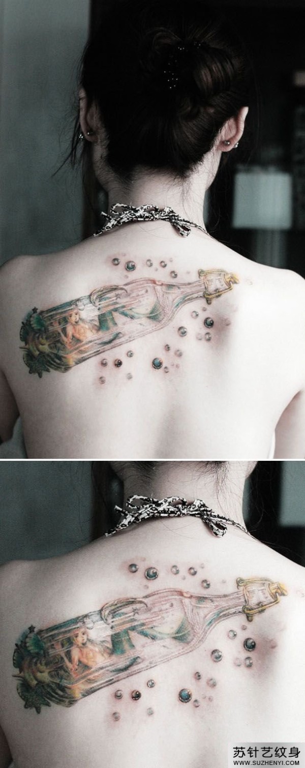 唯美漂亮的美人鱼漂流瓶后背纹身_后背纹身图案大全_纹身图吧