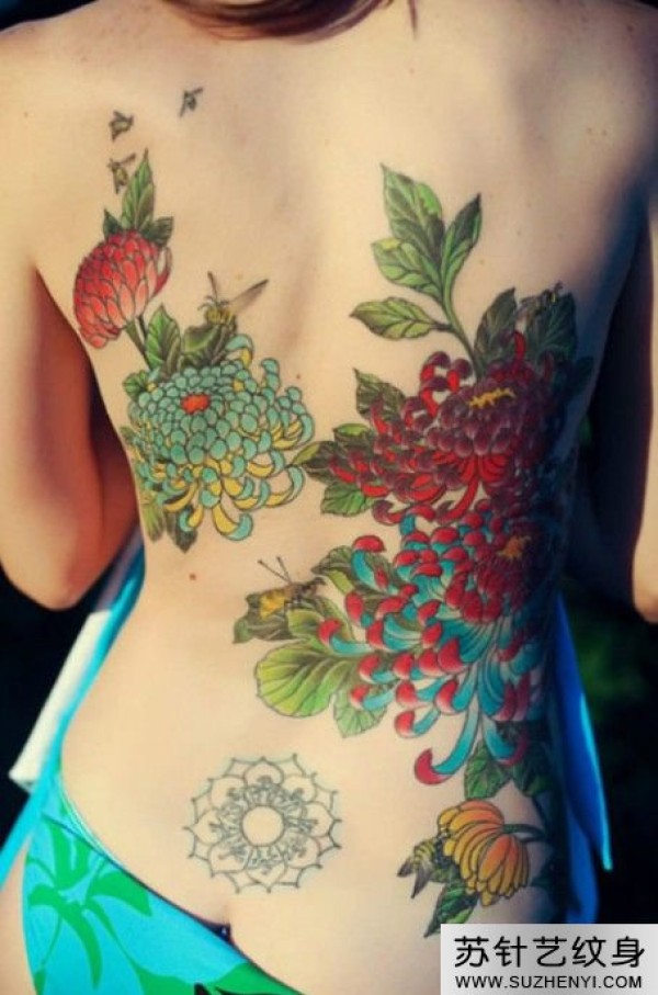 唯美彩色菊花满背性感纹身图片_后背纹身图案大全_纹身图吧