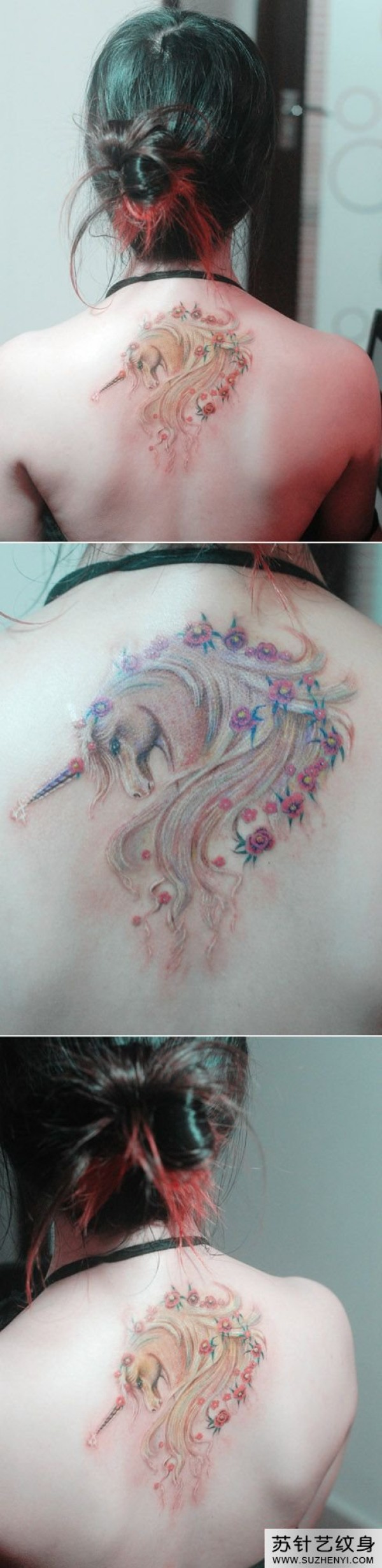 唯美粉色独角兽与花后背精美时尚纹身图_后背纹身图案大全_纹身图吧