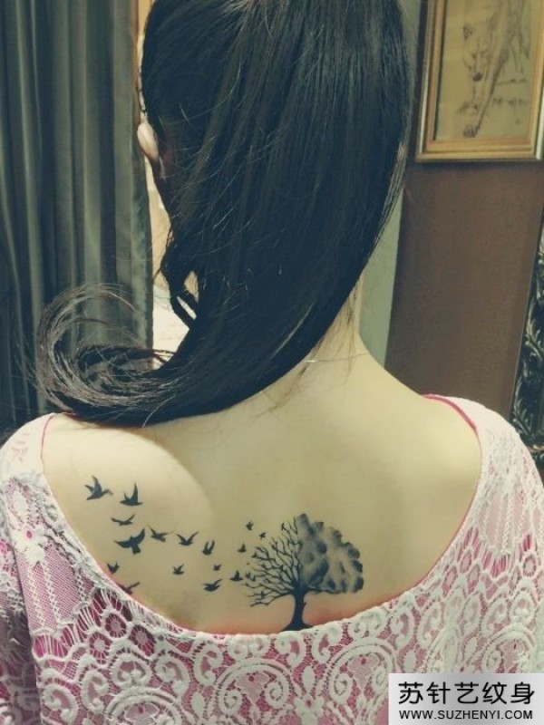 唯美时尚简单树与小鸟后背纹身_后背纹身图案大全_纹身图吧