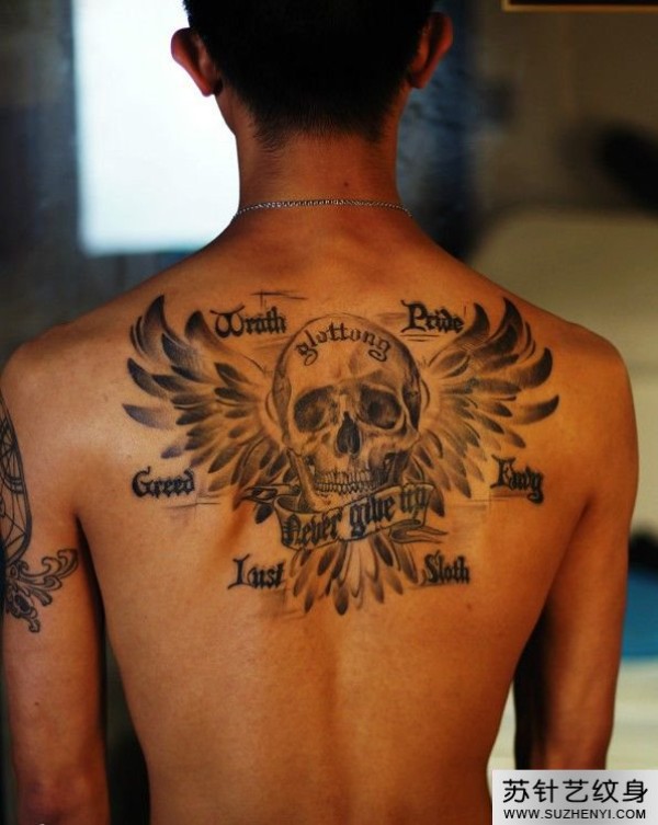 后背创意时尚黑羽七宗罪纹身_后背纹身图案大全_纹身图吧