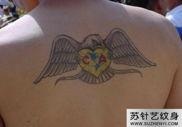 后背个性老鹰与心纹身图_后背纹身图案大全_纹身图吧
