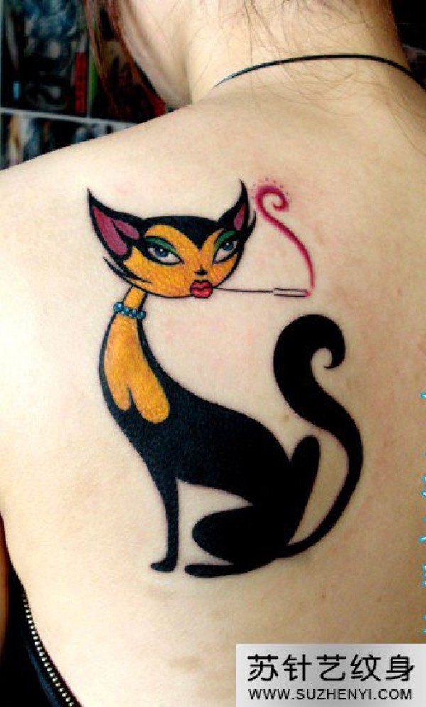 后背个性创意抽烟猫咪纹身_后背纹身图案大全_纹身图吧