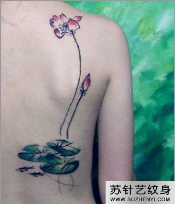 后背彩色荷花国画个性纹身图_后背纹身图案大全_纹身图吧