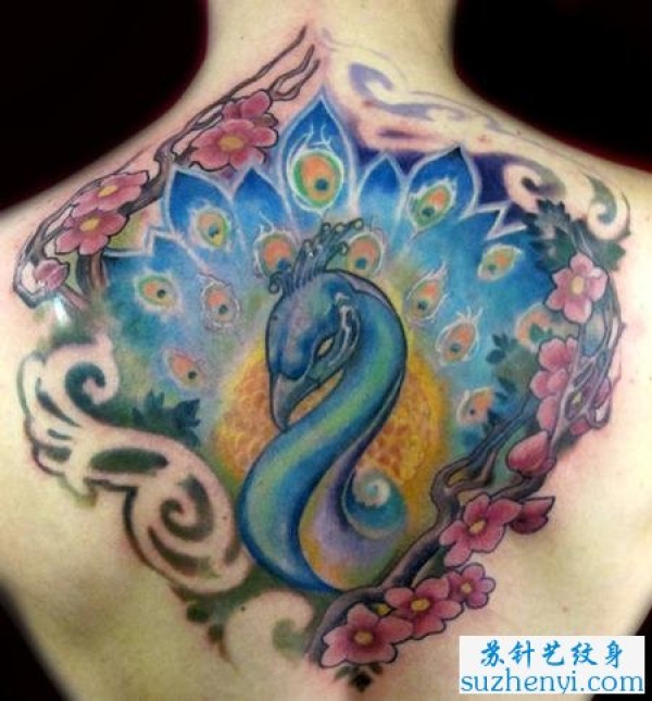 后背孔雀樱花纹身_后背纹身图案大全_纹身图吧
