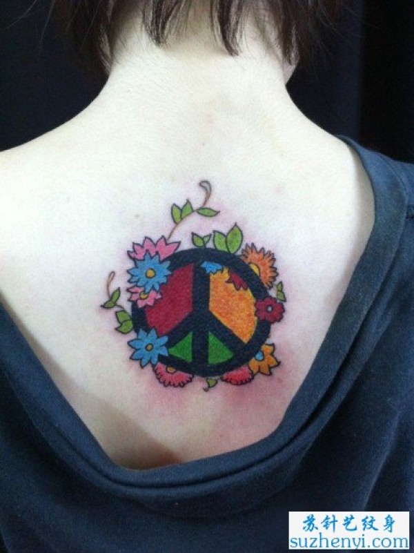 背部一枚彩色的反战符号纹身图案_后背纹身图案大全_纹身图吧