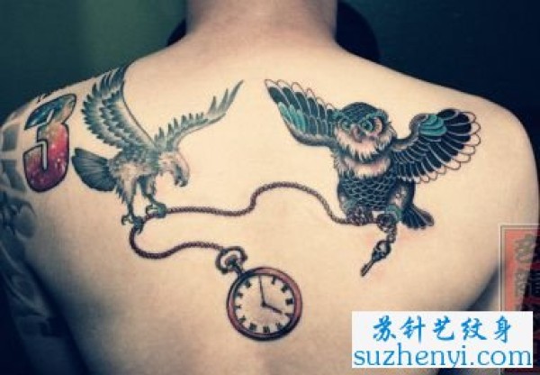 背部老鹰与猫头鹰纹身_后背纹身图案大全_纹身图吧