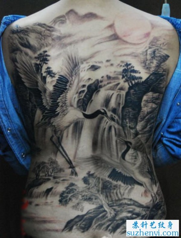 满背仙鹤白鹤纹身_后背纹身图案大全_纹身图吧
