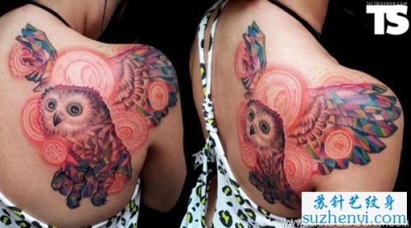 背部彩色猫头鹰纹身_后背纹身图案大全_纹身图吧