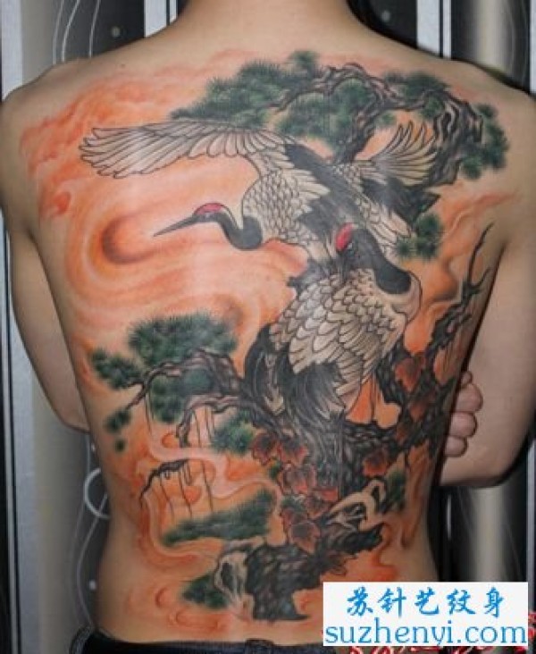 满背白鹤仙鹤纹身_后背纹身图案大全_纹身图吧