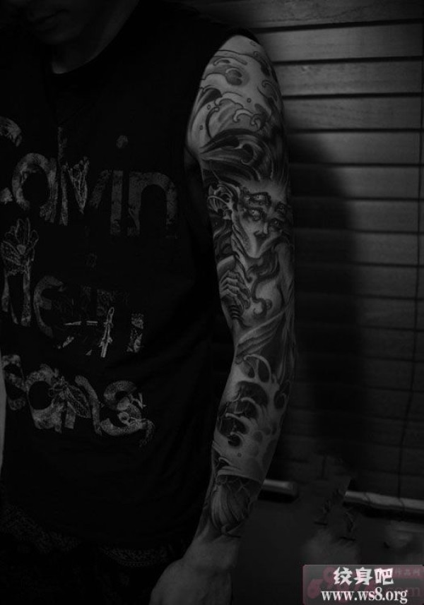 男子全灰人鱼花臂欣赏_臂部纹身图案大全_纹身图吧