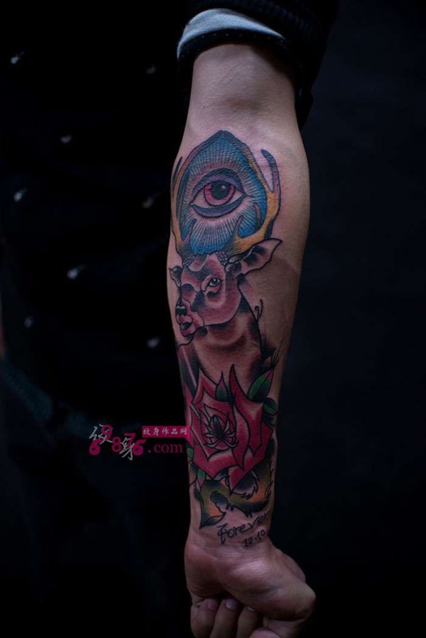 创意上帝之眼与鹿花小臂纹身_臂部纹身图案大全_纹身图吧