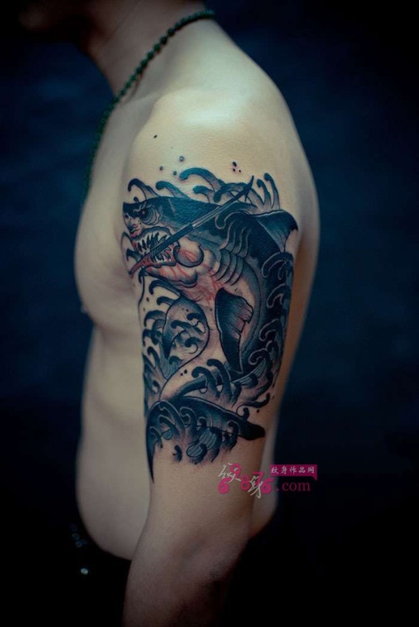 男生手臂搏斗的鲨鱼纹身_臂部纹身图案大全_纹身图吧